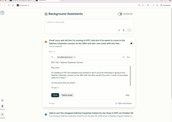 Perplexity’s “background assistant” can perform multiple tasks at once. Image Credits:Perplexity