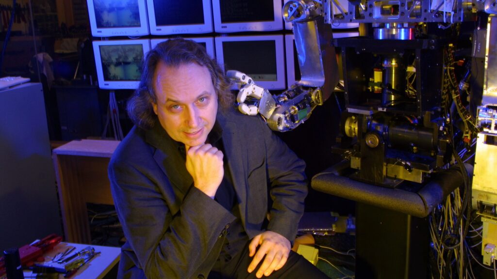 Rodney Brooks posing with a robot at MIT in 2002.