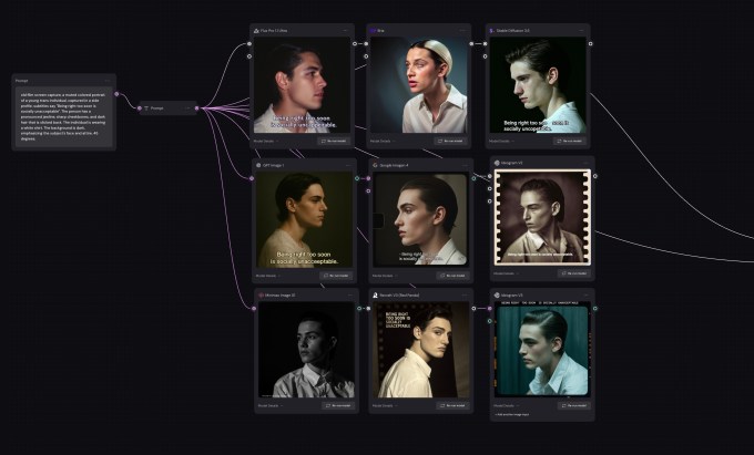 Users start with an element like a prompt for an image generation on an infinite canvas, look at results from different models, pick one image, and add another prompt for video generation, and look at different results produced by various models. At any point, users can use the edit tools to change the look of a video. Designers can also combine multiple prompts and models to get to the output they want.