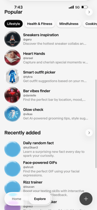 Wabi’s Explore page currently features recent and popular apps, though Kuyda said it will become more algorithmic over time. The startup plans to launch personalized onboarding in the coming weeks, automatically generating starter apps for new users.