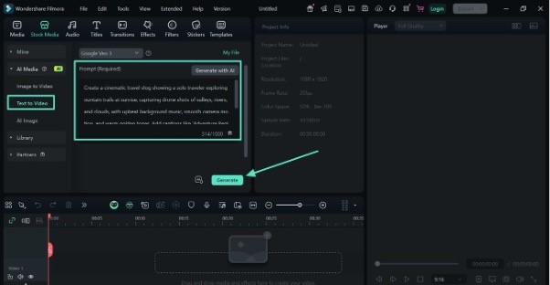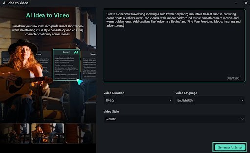 This feature lets you type a short prompt, paragraph, or full script. Filmora's AI studies tone, theme, and structure to make a matching video. In seconds, your text becomes visuals, subtitles and clips with natural rhythm. It's great for teachers, marketers and storytellers who need fast, smart creation.