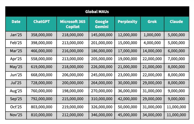 ChatGPT has seen its global monthly active users climb by 180% year-over-year as of November 2025, while Gemini’s monthly active users are up 170%.