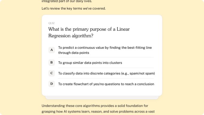 With the new version, the app will first understand your goal and then generate chapters based on that to help you learn about those topics. What’s more, users will see other modalities like quizzes appear within the course material seamlessly. For some courses, Oboe will also generate flashcards for you to easily remember course materials.