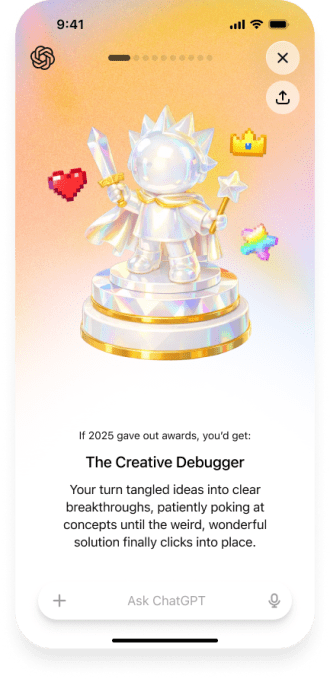 Similar to other annual reviews offered by consumer apps, “Your Year with ChatGPT” takes inspiration from the popular year-end look back, Spotify Wrapped. Like Spotify’s feature, OpenAI uses catchy graphics and personalizes the experience to the individual by giving out “awards” based on how you’ve used ChatGPT throughout the year.