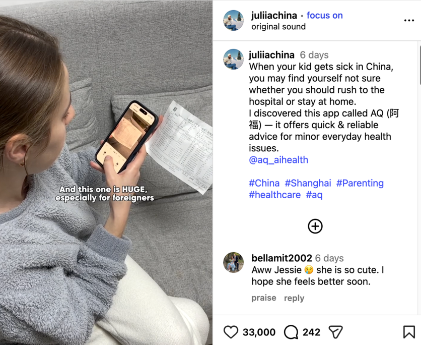 Julia, a Shanghai-based creator with 1.4 million followers, went viral demonstrating how AQ helped her identify her child's skin allergy, bypassing language barriers and hospital queues.