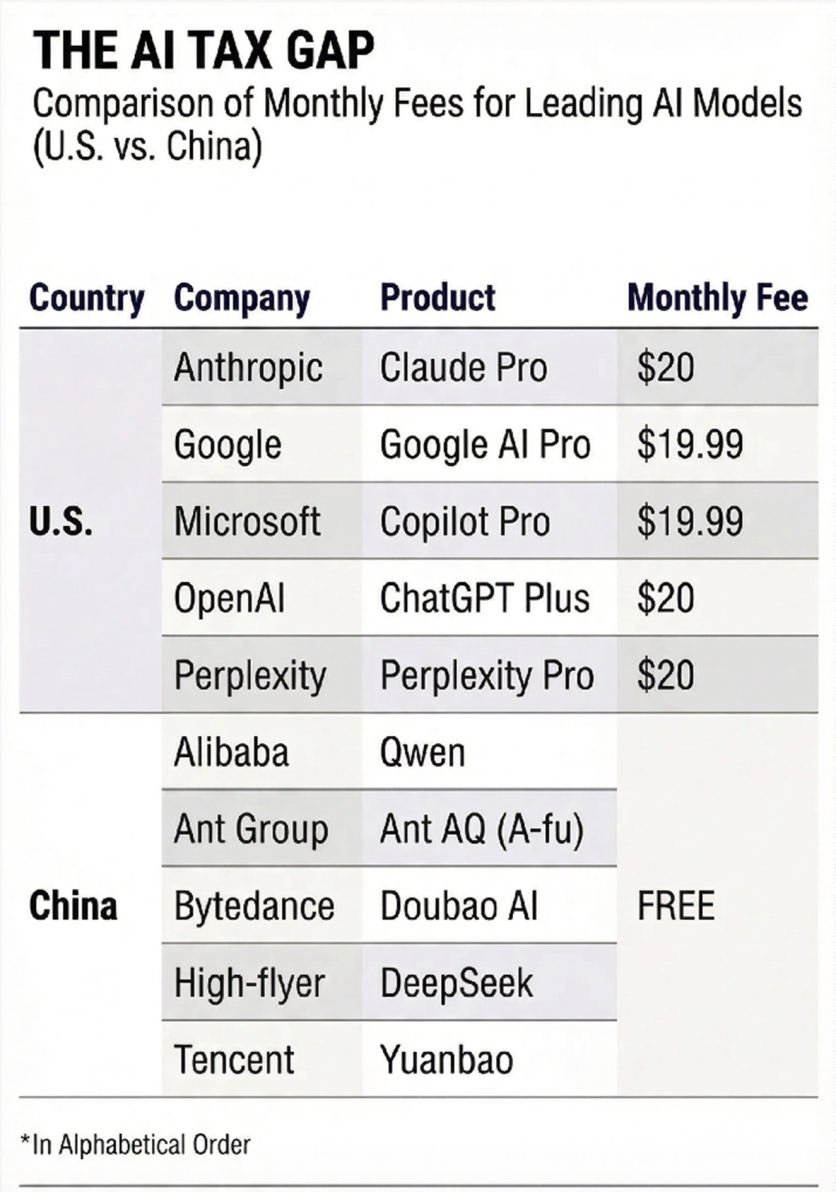 The AI Tax Gap — Comparison of Monthly Fees for Leading AI Models (U.S. vs. China)