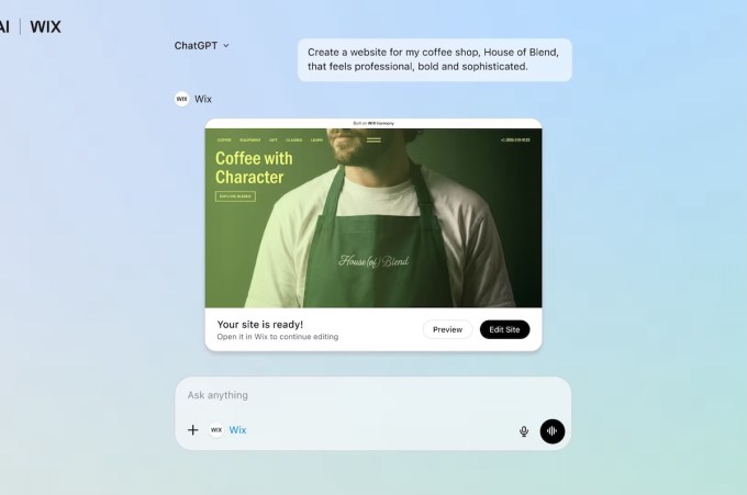 In March 2026, website builder Wix launched its integration, allowing users to prompt ChatGPT to create a functional website with just a text or voice prompt. Users can describe the capabilities they want the website to have, how it should look, and other desired features. Additionally, existing Wix users can manage their business within ChatGPT, which can handle scheduling, payments, SEO, accessibility, performance, security, and more.