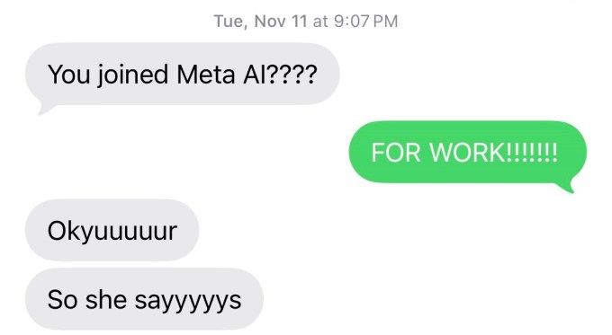 At some point, Meta started sending people Instagram notifications about which of their friends were using the Meta AI app, presumably to encourage them to download it. It has been almost a year. I continue to get texts from my friends in which they alert me that Instagram told them I am on the Meta AI app. This is generally considered to be uncool behavior.