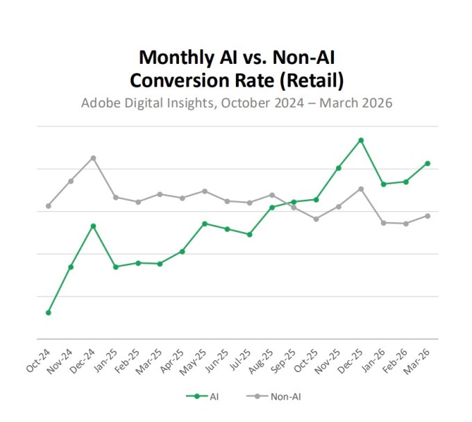 Adobe’s data found that AI traffic converted 42% better than living, breathing customers in March 2026, setting a new record. Notably, it’s a reversal of a trend that told a different story only a year ago: in March 2025, AI traffic converted 38% worse than regular people.