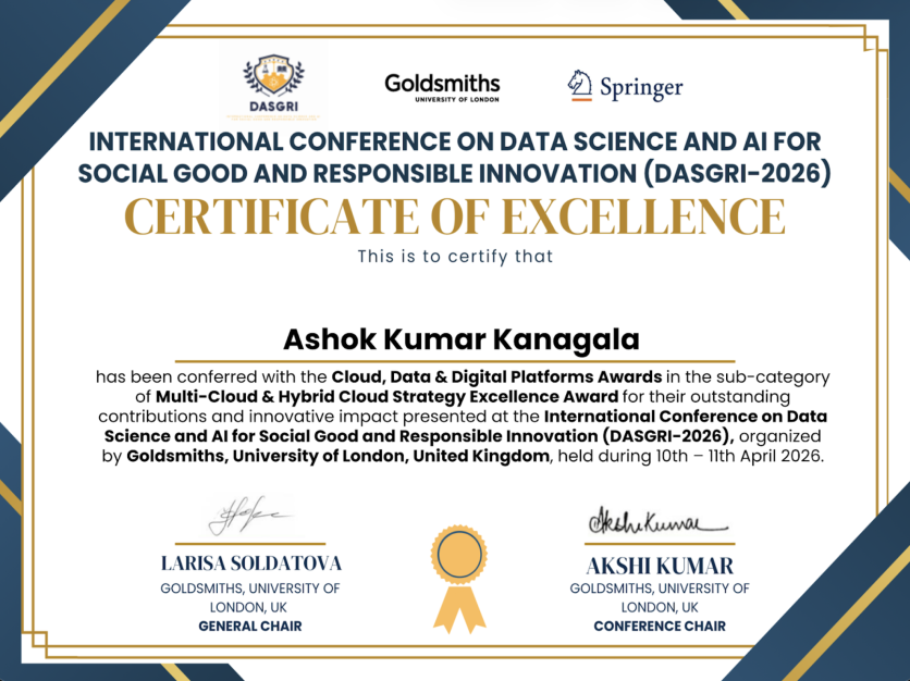 Ashok Kumar Kanagala, a cybersecurity and cloud security specialist, has received international recognition for his contributions to secure multi-cloud architecture and artificial intelligence governance, following multiple awards presented through globally affiliated academic and research conferences.