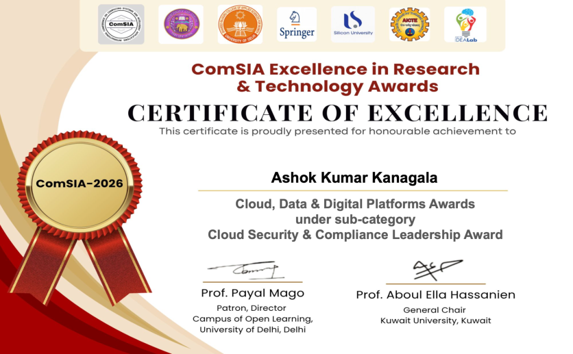 In addition to this recognition, Kanagala was also awarded the Cloud Security & Compliance Leadership Award under the Cloud, Data & Digital Platforms category at the ComSIA 2026 international conference. The award recognizes leadership in advancing secure cloud infrastructure and compliance-driven digital transformation initiatives across enterprise environments.
