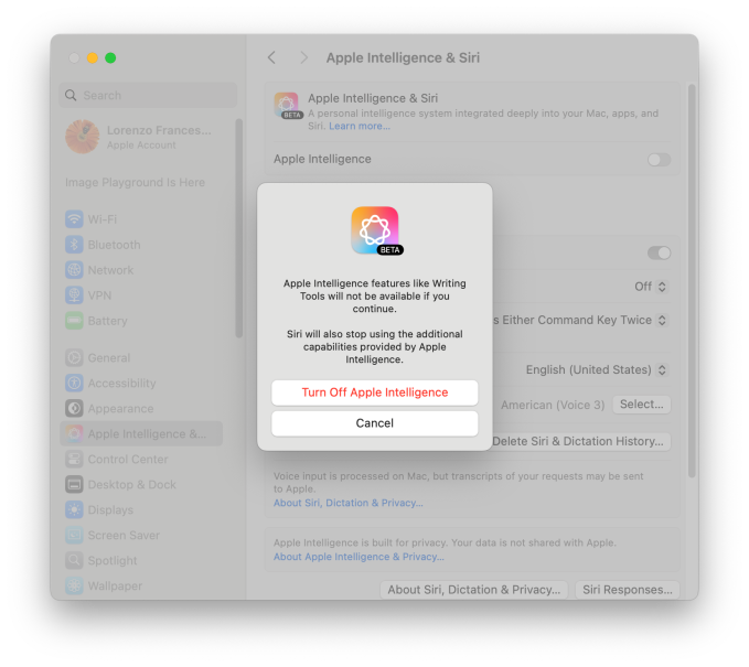 You will have to confirm you want to stop using Apple Intelligence in a dialog that will open once you click on the toggle.