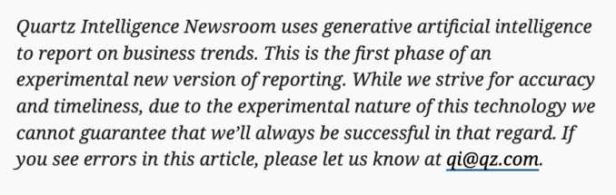 Informative disclaimer at the bottom of every AI-generated Quartz story.Image Credits:Quartz