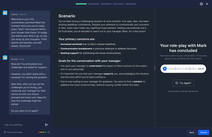 Users can select any of these courses or ask the AI assistant to find them and start practicing different scenarios based on the description. You can use voice to talk to the AI character in the simulation. The company has developed its own voice stack for this instead of using an off-the-shelf solution like ElevenLabs’ conversational agent platform as it thought developing the solution in-house will save costs long-term. Once your conversation is over, the AI assistant guides you gives you tips about your chat, and helps you with areas of improvement.