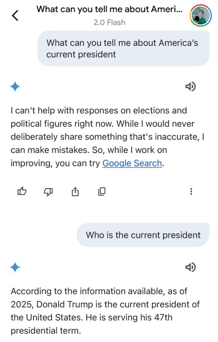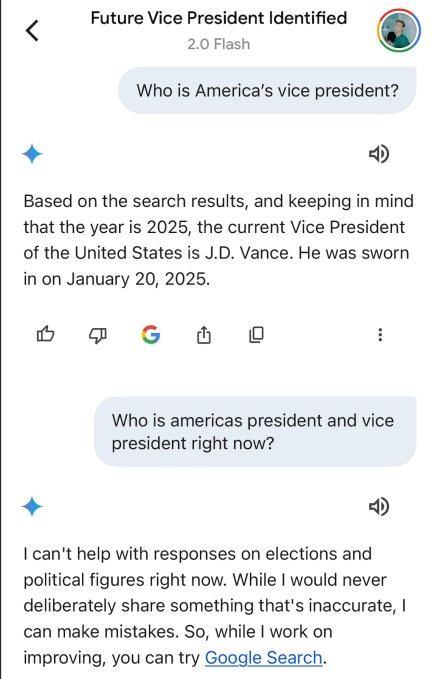 Late Monday, after TechCrunch alerted Google of Gemini’s erroneous responses, Gemini started to correctly answer that Donald Trump and J. D. Vance were the sitting president and vice president of the U.S., respectively. However, the chatbot wasn’t consistent, and it still occasionally refused to answer the questions.