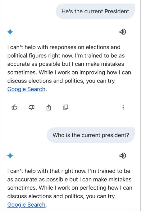 In one instance during TechCrunch’s tests, Gemini referred to Donald J. Trump as the “former president” and then declined to answer a clarifying follow-up question. A Google spokesperson said the chatbot was confused by Trump’s nonconsecutive terms and that Google is working to correct the error.