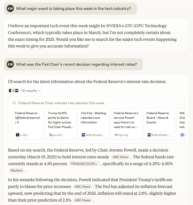 In my brief testing of the feature, web search didn’t consistently trigger for current events-related questions. But when it did, Claude indeed delivered an answer with inline citations, pulling from sources including social media (e.g. X) and new sources like NPR and Reuters.