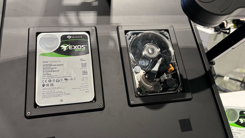 Seagate also had a proof-of-concept demo that included NVMe HDDs. When it comes to NVMe, we naturally think of SSDs, but HDDs with the interface have been under development for quite some time. Extra performance isn't the goal, though. Seagate says utilizing the NVMe interface will enable scaling pools of SSDs up to the exabyte level by utilizing the fast and flexible NVMe-over-Fabrics (NVMe-oF) protocol. When deployed into software-controlled tiered storage systems in tandem with NVMe SSDs, Seagate thinks it has the winning formula for top-tier AI server storage performance.