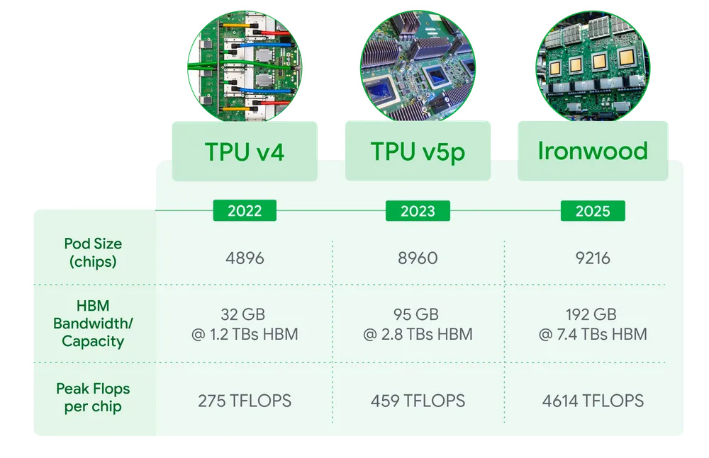In its larger incarnation, Google's Ironwood pods can generate a staggering 42.5 Exaflops of inference computing. Each chip has a peak throughput of 4,614 TFLOPs, which Google claims is a substantial improvement over previous chips. Google has also boosted memory for the new TPUs, with each chip sporting 192GB, which is six times more than Google's last-gen Trillium TPU. The memory bandwidth has also increased to 7.2 Tbps, a 4.5x improvement.