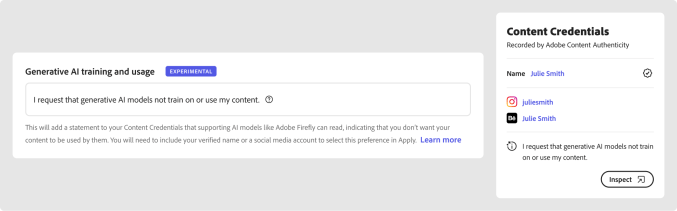 While the field is present on the app and subsequently on an image’s metadata with content credentials, Adobe hasn’t signed an agreement with any of the AI model creators to adopt this standard. The company said it’s in talks with all top AI model developers to convince them to use and respect this standard.