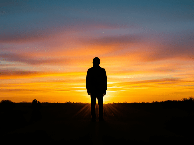 Here’s an image from the standard model generated with the prompt “A person standing in front of a sunset, in majestic surroundings.”