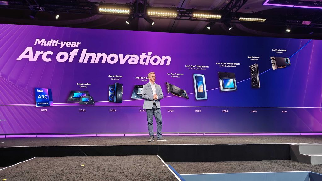 Dan Rogers is now out on stage. He admits that Intel has been "lacking in key features, driver support, and performance" when it comes to long history of Intel GPUs. However, Intel is "light years" ahead of where it was a few years ago with GPU.