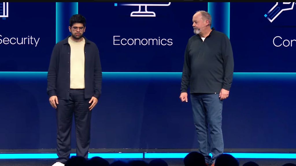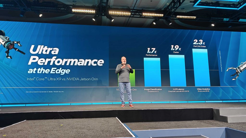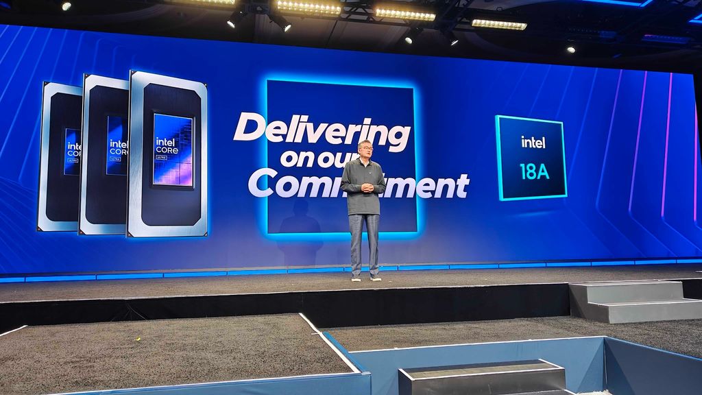 A surprise appearance by Intel CEO Lip-Bu Tan on the stage at the Venetian. "Intel is delivering on its commitment to ship its first 18A products by the end of 2025. Intel is ramping all Core Ultra Series 3 die packages as we speak. Intel is uniquely positioned to deliver this kind of product, he says, across design, process, and packaging."