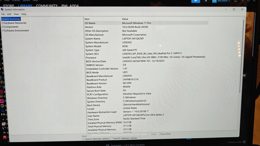 Intel set us up with a reference system made by Lenovo. You can see the system information above. This is an IdeaPad Pro 5 running the top-end Core Ultra X9 388H chip from Panther Lake, along with 32GB of memory. For testing, the system was perched on a stand for better airflow, and the games were running off of an external PCIe Gen 4 NVMe SSD connected via USB-C.