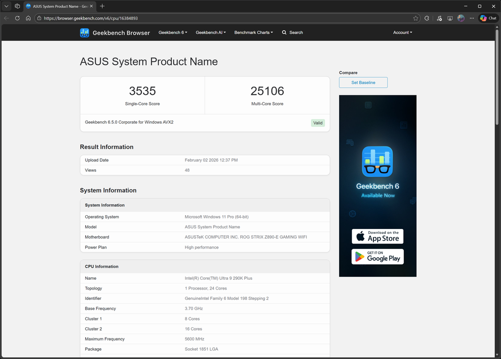 The run was conducted on an Asus ROG Strix Z890-E Gaming Wi-Fi motherboard with 64 GB of DDR5-6800 memory. The chip netted 3,535 points in the single-core test, roughly 10.5% higher than its predecessor's 3,200 points. Comparing it to all the entries on Geekbench's processor benchmarks charts, that score actually puts the 290K Plus at the very top.