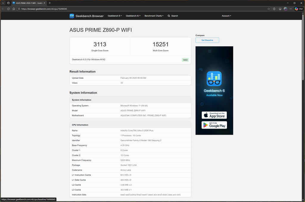 This processor ended up scoring 3,113 points in the single-core test and walked away with 15,251 points in the multi-core test. Those are some pretty solid numbers and in line with what we expect from a new Core Ultra 5 desktop processor. For some reason, Geekbench's CPU database doesn't include the 245K so we don't have a direct point of comparison, but we can still search for individual runs on the platform.