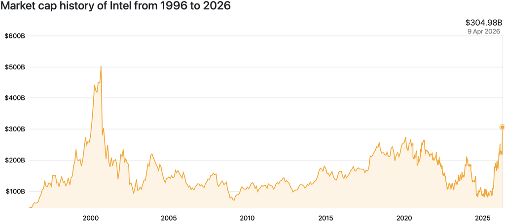 Still, Intel's valuation history reflects a transition from a dominating CPU vendor commanding PCs and servers to a mature, execution-sensitive semiconductor company. Intel's market capitalization today is driven more by its strategic narratives associated with AI, foundry, and process technology ambitions, and mid-term product roadmaps than by its earnings. The recent climb toward ~$300 billion indicates renewed investor optimism, but unlike the 2000 peak, this optimism is based on expectations of a turnaround rather than on the already achieved dominance and expectations for skyrocketing sales.
