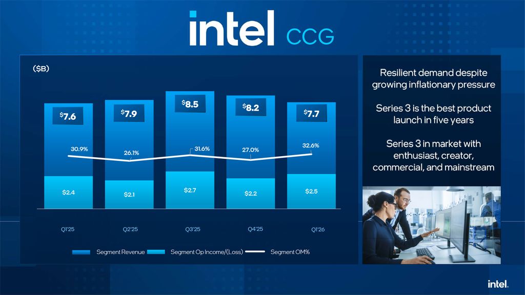 The Client Computing Group (CCG) generated $7.7 billion in revenue, $2.5 billion operating income, and 32.6% operating margin in Q1 2025, which is clearly up from $7.6 billion revenue, $2.4 billion operating income, and 30.9% operating margin in the same quarter a year ago. Keeping in mind that sales of PCs in the first quarter were affected by the turmoil on the DRAM and storage markets as well as demand outstripping supply (partly because Intel continues to shift some capacity from client to data center products) CCG's results can be considered good.