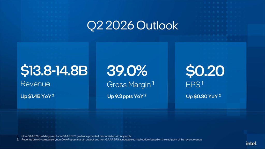 Intel expects its second quarter of 2026 to show modest sequential growth and projects revenue to be from $13.8 billion to $14.8 billion and non-GAAP gross margin of 39%.