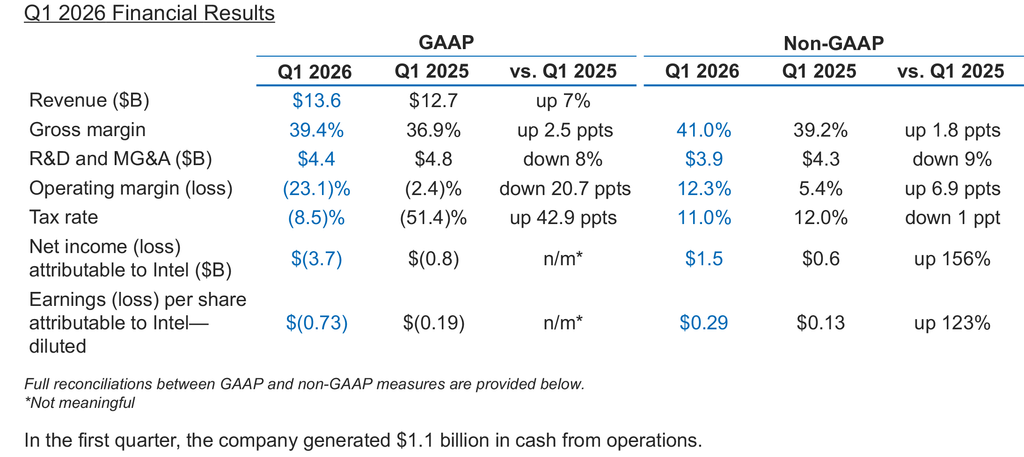 In the first quarter of 2026, Intel earned $13.6 billion in revenue, up 7% year-over-year (YoY), and flat with the fourth quarter of 2025, meaning that the results are well above seasonality. The company's R&D and SG&A expenses totaled $4.4 billion, down 8% from $4.8 billion in the same quarter a year ago, whereas its gross margin increased to 39.4% from 36.9% in Q1 2025. In addition, Intel generated $1.1 billion in cash from operations. Nonetheless, the company recorded a $3.7 billion GAAP loss in the first quarter of 2026, up massively from $800 million in Q1 2025.