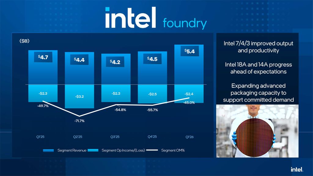Intel's Foundry division produces the company's most profitable products for client and data center applications and also absorbs all the losses of the company. The division generated $5.4 billion in revenue last quarter (up from $4.7 billion in Q1 2025), but posted an operating loss of roughly $2.4 billion (up from $2.3 billion in Q1 2025), which means an operating margin near -45%.