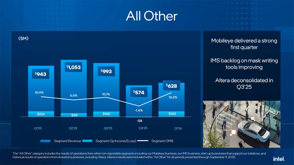 Intel's 'All Other' segment — which includes Mobileye and IMS mask writing services — remains small after deconsolidation of Altera in Q3 2025. During the quarter, its revenue totaled $628 million, down 33% year-over-year (largely due to the deconsolidation of Altera), but at the same time, the segment generated $102 million in operating income, which is good news as it lost $8 million in the previous quarter.