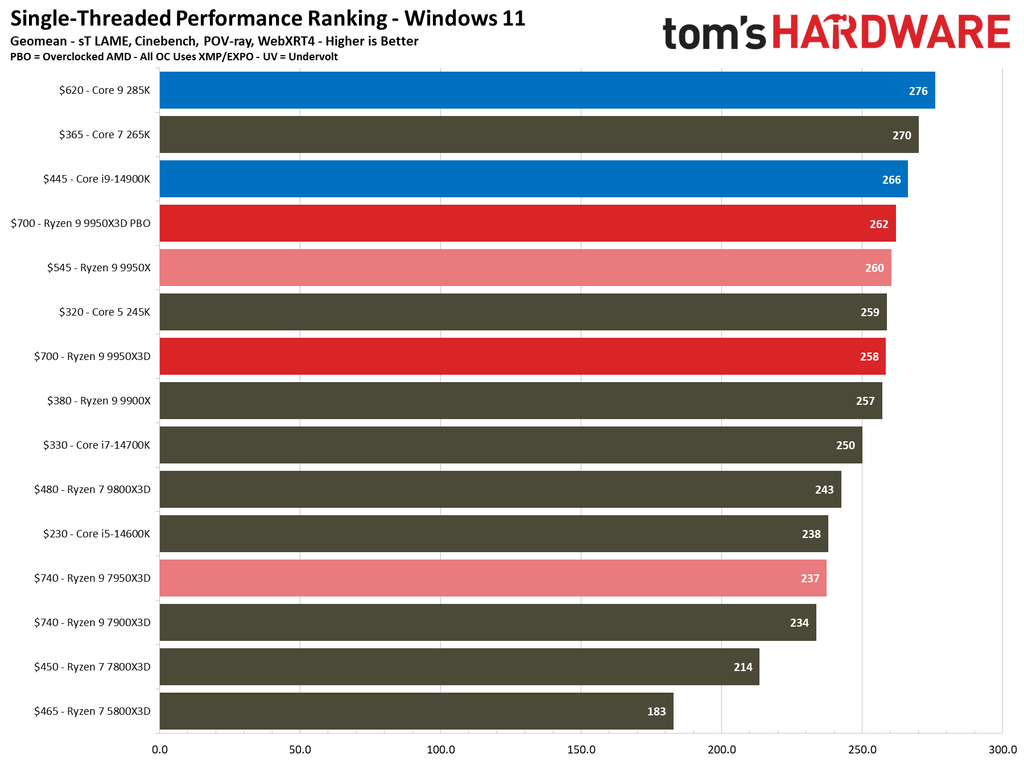 In gaming performance, the Ryzen 9 9950X3D is still leagues ahead of anything not packing AMD's 3D V-Cache, managing to keep pace with the popular eight-core variant. It also tops the charts in productivity performance, though Intel's cheaper Core Ultra 7 270K Plus isn't far behind.