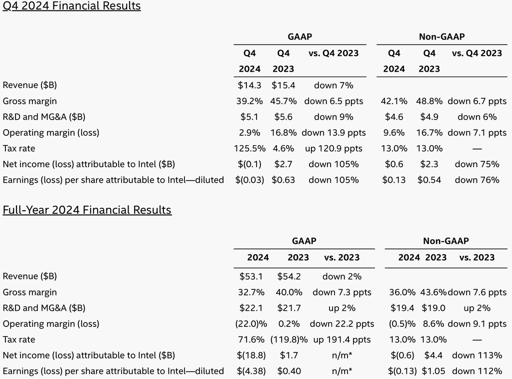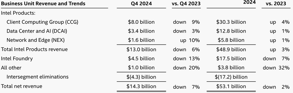 Intel's fourth-quarter results for 2024 showed that the company earned $14.3 billion in revenue, up $1 billion from the previous quarter but down 7% from the same quarter a year ago. During Q4, the company posted a $100 million loss, whereas in Q4 2023, its profit was $2.7 billion.