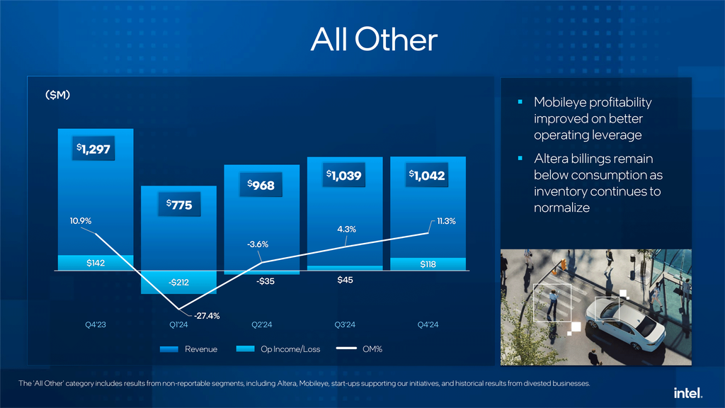Altera delivered revenue of $429 million, up 4% sequentially, with an operating margin of 21% compared to 2% in Q3. Mobileye reported revenue of $490 million, up 1% sequentially, with an operating profit of $103 million.