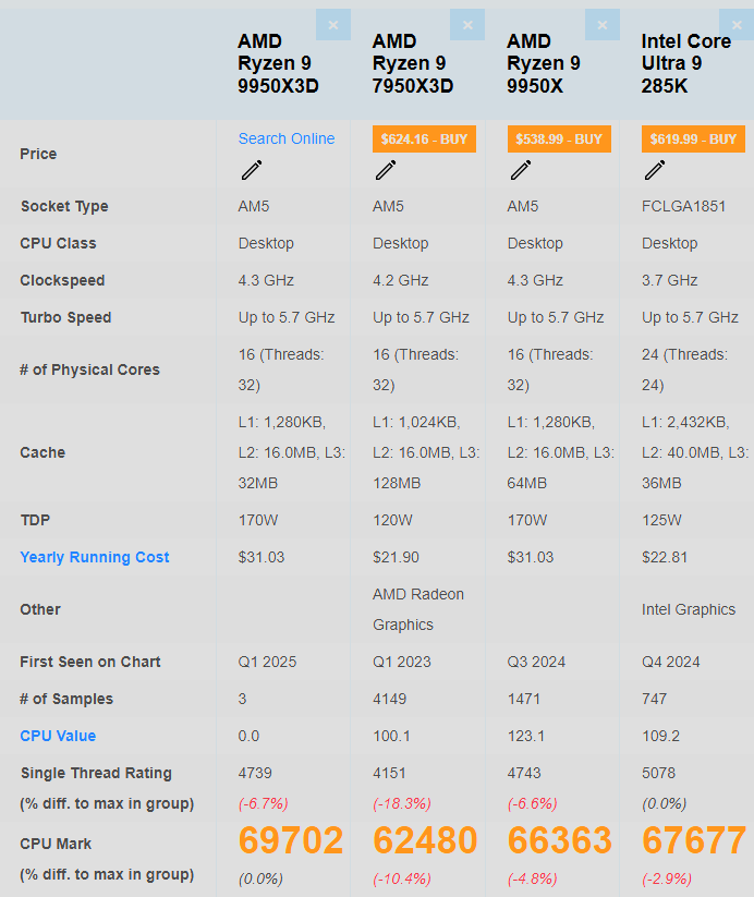 CPU Mark, which is a proprietary set of benchmarks used to gauge a processor's performance, sees the Ryzen 9 9950X3D lead the pack, boasting an 11% lead against the Ryzen 9 7950X3D. From the looks of it, CPU Mark can leverage the extra L3 cache, as a result of which the 9950X3D ends up 5% ahead of the 9950X. This ability to extract more performance from added cache is not code-agnostic, so don't expect a similar outcome in every scenario.