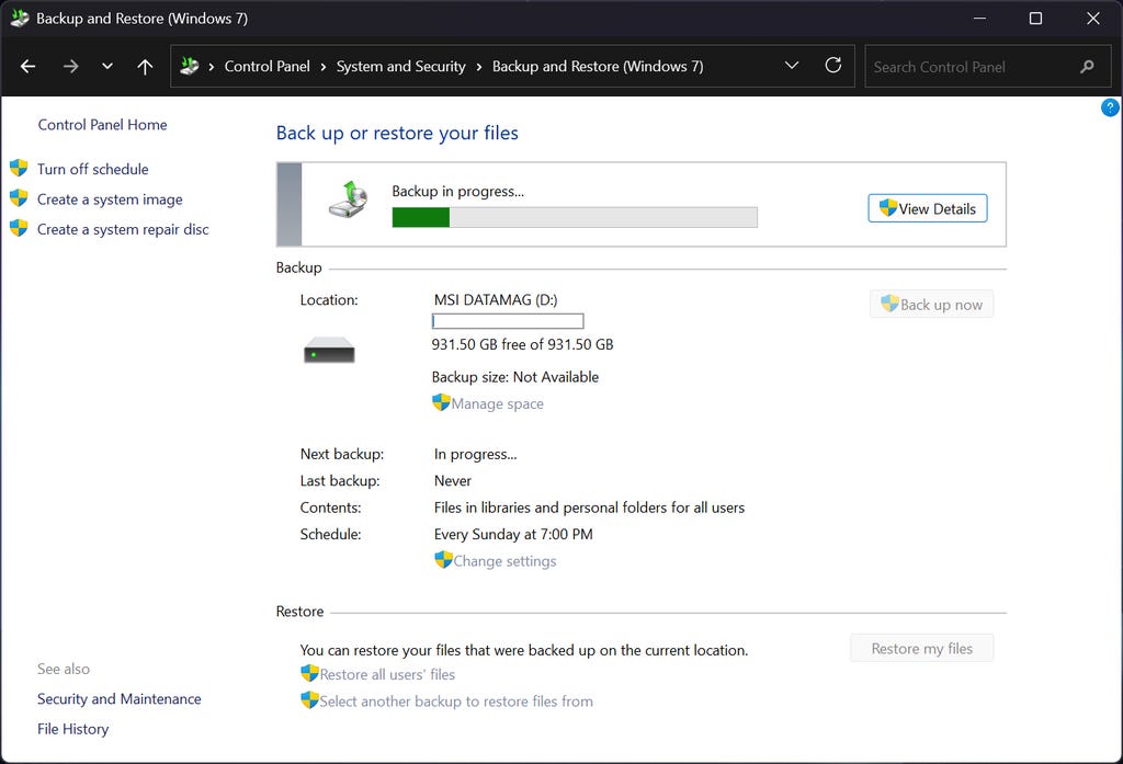 From this location in the Control Panel, you'll be able to manually start a back up by simply clicking the Back up now button. By default, Windows will perform a back up every week, but you can change the schedule in settings. Also from this location, you can restore files from a previous backup.