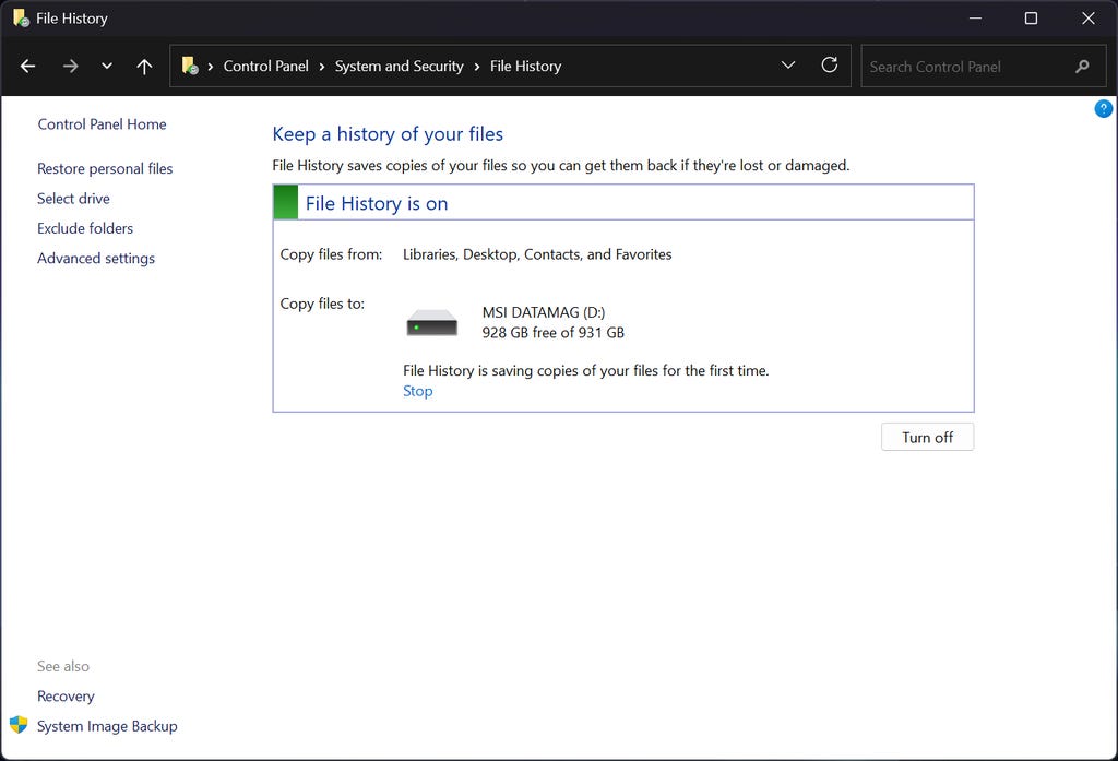 File History is another backup tool you can access from the Windows Control Panel. Go to System and Security > File History to enable it. It'll copy files from the local folders in your Windows library as well as anything on your desktop, plus your contacts and favorites. From the left, you can click Exclude folders to tell File History to skip certain things.