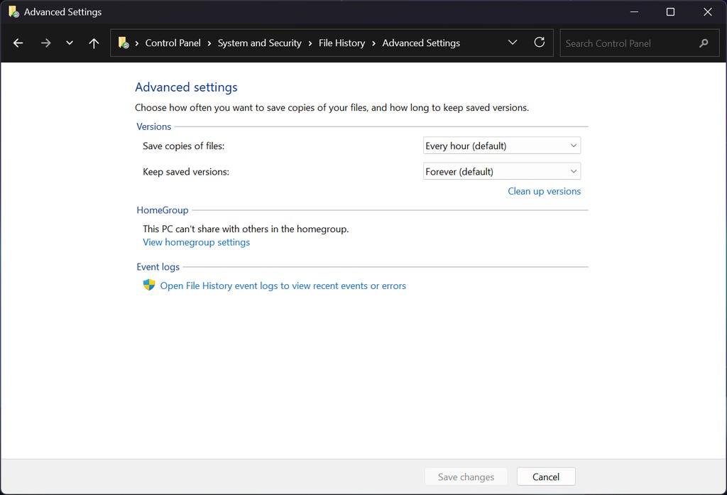 And if you click Advanced settings on the left, you can choose how often File History should save your files and for how long. By default, File History will back up your data every hour, but you can set it for as often as every 10 minutes or once a day, too. File History will keep backups forever, but you can change it to keep your files between one month and two years -- or as space is needed.
