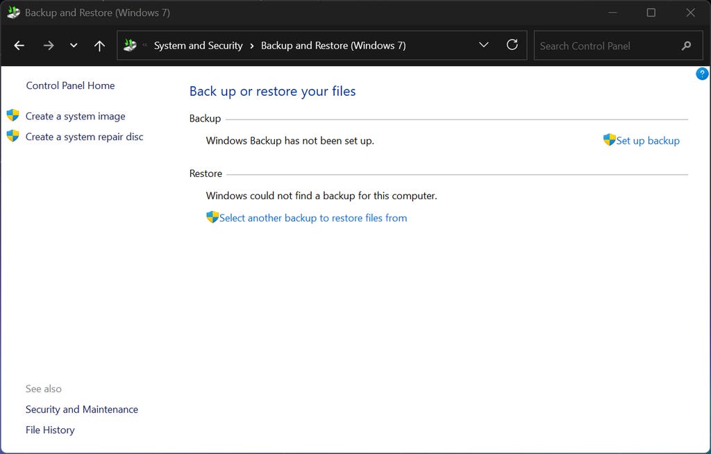 In Windows 11, connect your external drive to your PC. Open the Control Panel and navigate to System and Security > Backup and Restore (Windows 7) and click Set up Backup. (You can ignore the Windows 7 bit. It's just a holdover from an earlier version of Windows; the Control Panel remains quaintly antiquated.) From here, you can choose your external drive and then let Windows choose which files to back up, or you can choose the files and libraries you want to back up along with a full system image.