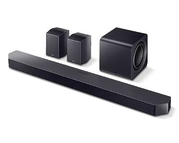 Tuned by Samsung’s LA Sound Labs, this beast of a bar is a belter. Compatible with Dolby Atmos, DTS:X, and Dolby TrueHD, it ships with a subwoofer and two wireless surround speakers.