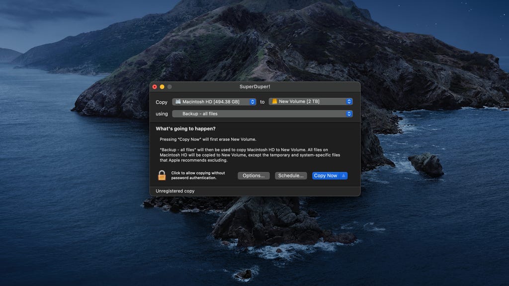 To clone your Mac hard drive to a secondary drive, we recommend using SuperDuper. It's a simple utility that will copy the entire drive, including your data, installed programs and boot sectors, onto your target drive. It's available as a paid program and has a free trial.