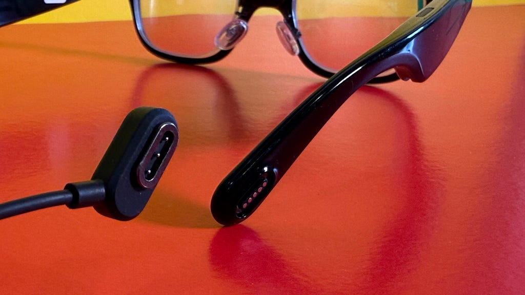 Another clever idea on these glasses is a magnetic pin charge dongle that attaches directly to the right arm of the glasses, similar to Viture's recent display glasses. This means you could charge up the Rokid Glasses when they're off your face, or while they're still on.
