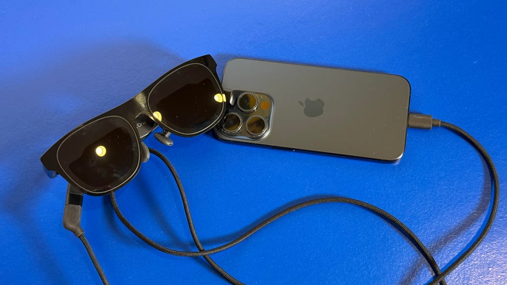 Tethering an Xreal One pair of display glasses with an iPhone. Smart glasses and display glasses work with phones now, but they need to be able to connect even better. Scott Stein/CNET