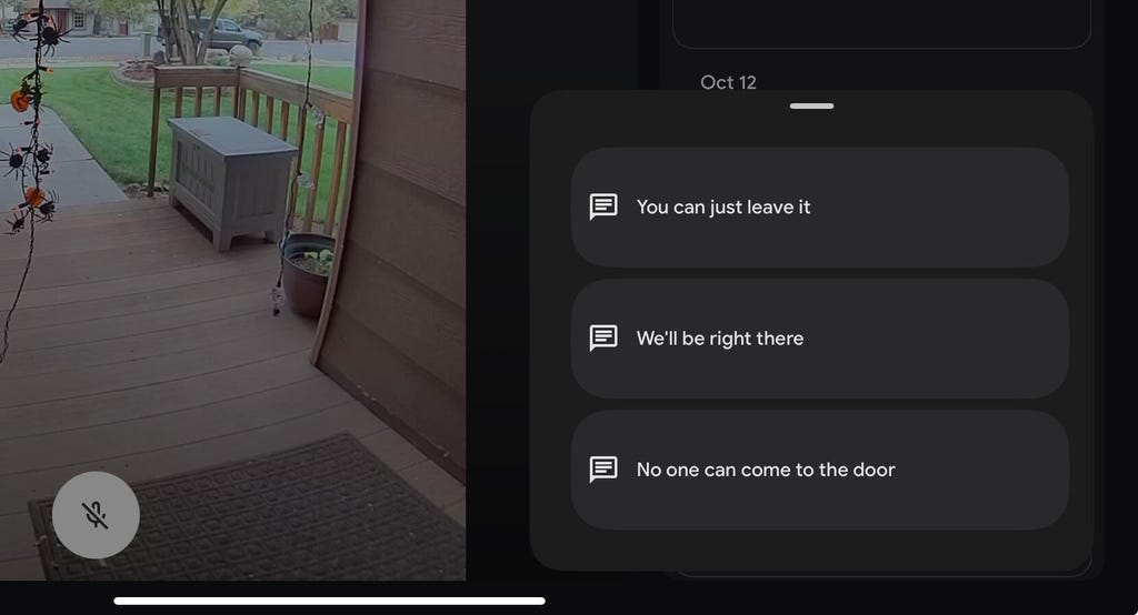 For doorbells like Google Nest models, quick replies (here called Quick Responses) work a little differently. Instead of playing automatically when a doorbell is rung, these replies are made to be manually activated by the user. When a Nest doorbell sends an alert like, "Person detected," you can tap on that alert and then tap on the response that you'd like to use, like "You can just leave it." These options are also accessible via live view.