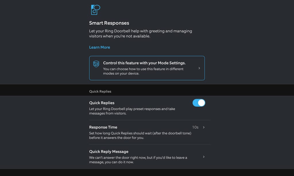 Look for the option to enable quick replies or responses. In Ring's app, that's under Smart Responses, so you should go there first. Here, you'll find options to enable quick replies or make sure the feature is functional.
